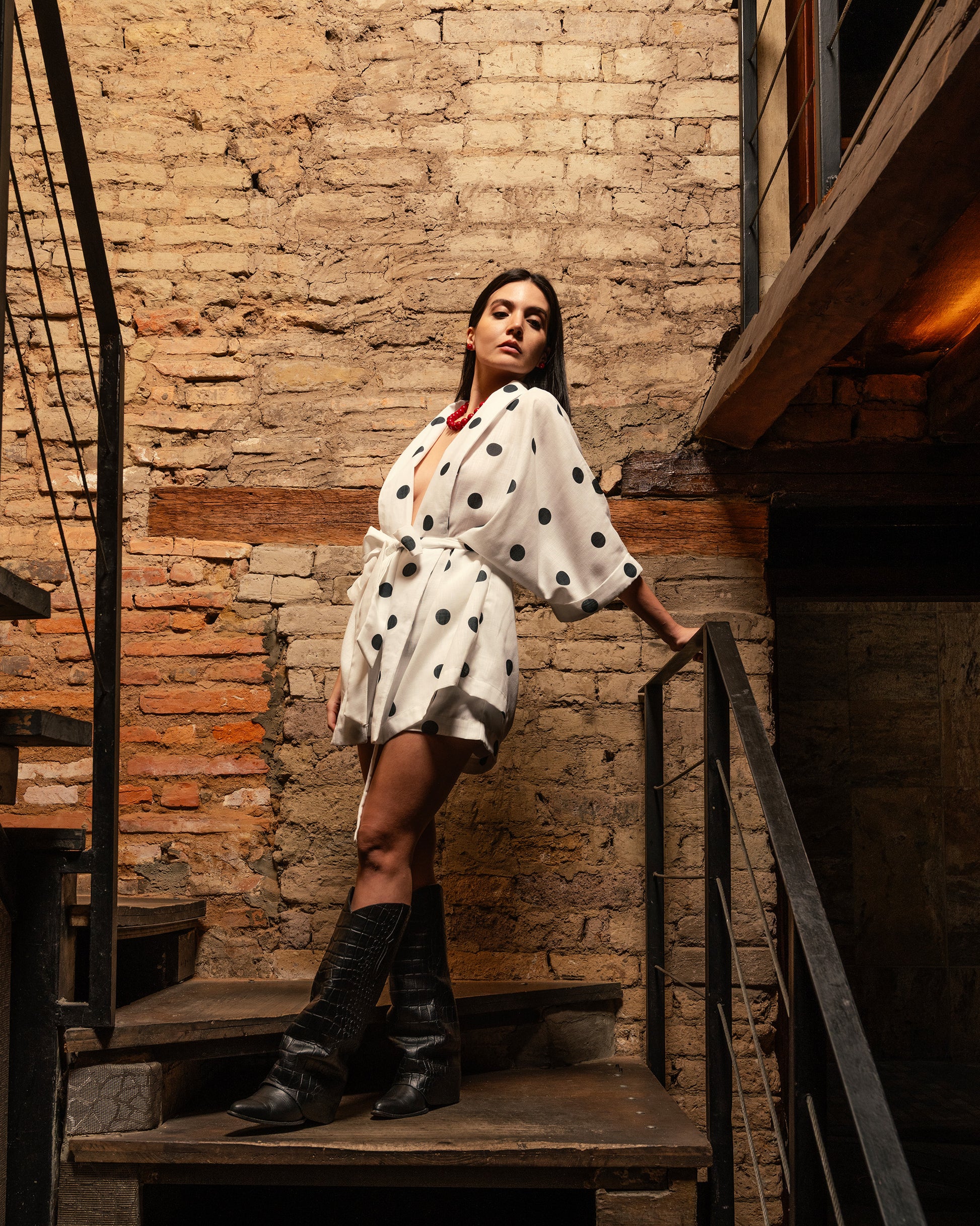 Este set estampado a lunares combina frescura y  modernidad. El kimono presenta un corte amplio y relajado con mangas tres cuartos y un lazo en la cintura que permite ajustarlo según el gusto. Acompañado de un short a juego aporta comodidad y ligereza, logrando un conjunto equilibrado, cómodo y versátil.