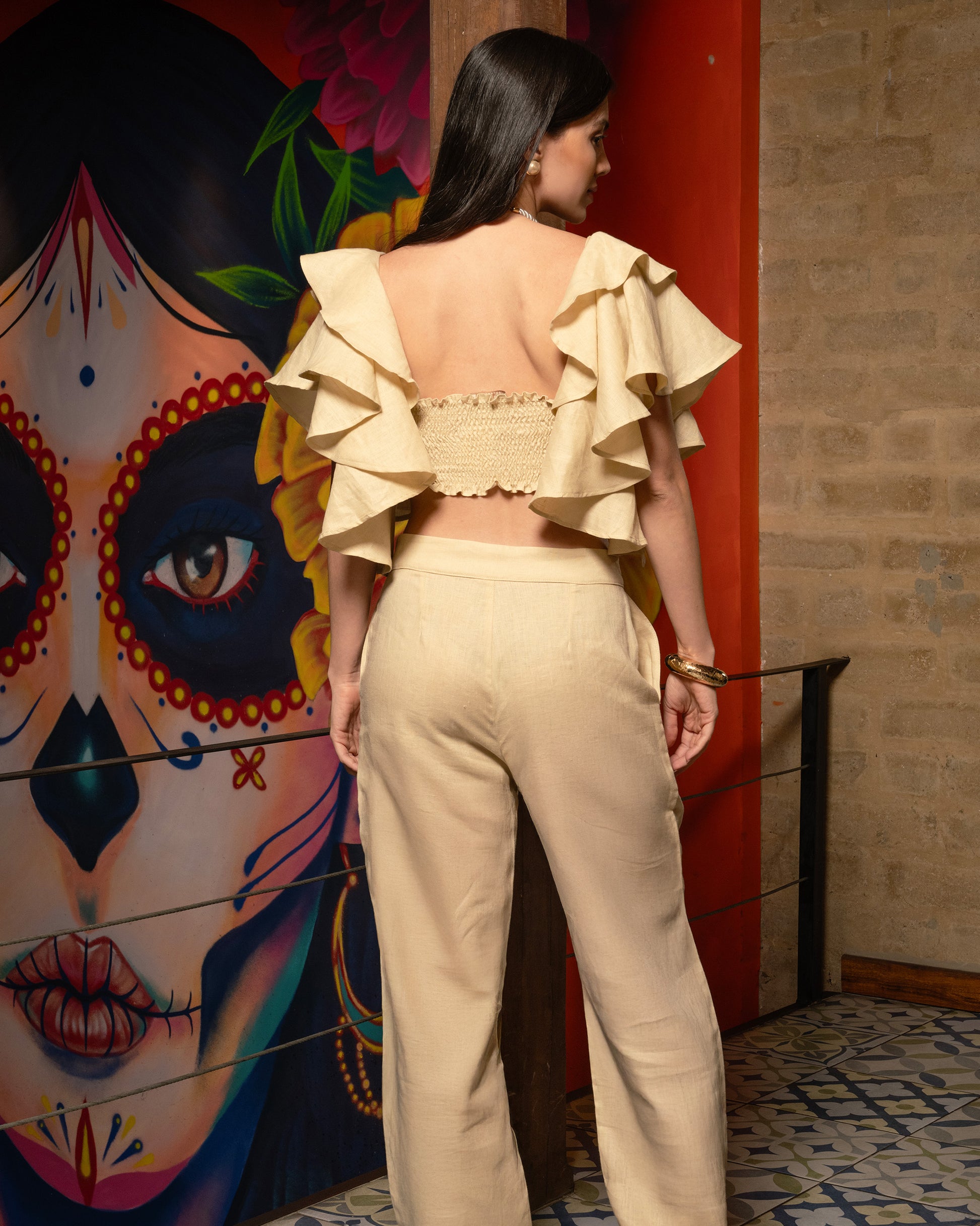Este set de dos piezas en lino color arena es una propuesta sofisticada, fresca y femenina. El top presenta un diseño con prenses en el delantero que realza el busto con sutileza, acompañado de volantes estructurados. El pantalón recto de tiro alto estiliza la figura, alargando visualmente las piernas.
